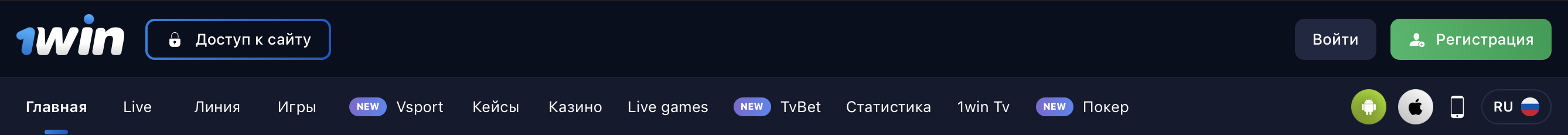 Главная фишка 1вин – отсутствие яркой картинки, которая только отвлекает пользователей. Разработчики выбрали лаконичный дизайн в тёмно-синих тонах, все надписи выполнены белым цветом, поэтому отлично читаются.